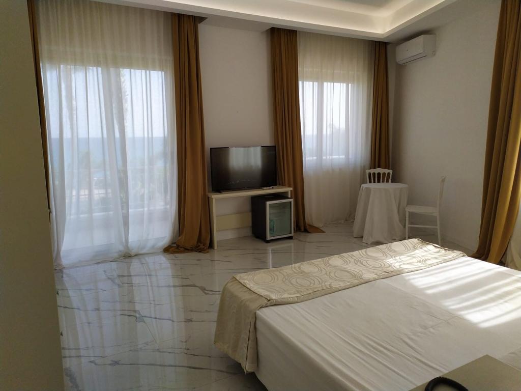 Un ambiente dal design raffinato con balcone vista mare e vista piscina. Climatizzazione, frigobar, tv sat led, cassaforte elettronica, telefono diretto e Wi-Fi free e… set di cortesia, bagno con box doccia, accappatoio, teli mare, asciugacapelli e ciabattine.
